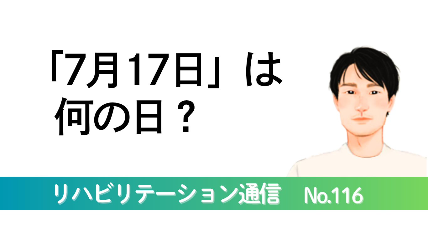 今回のテーマは「7月17日は何の日?」と題しました。結論から申し上げますと、7月17日は「理学療法の日」とされています。“9月のリハ通信なのに7月の内容?”と感じた方も多いと思いますが、このリハ通信の執筆時期がちょうど7月半ばであり、このテーマにいたしました。冒頭ですがご了承いただければ幸いです。