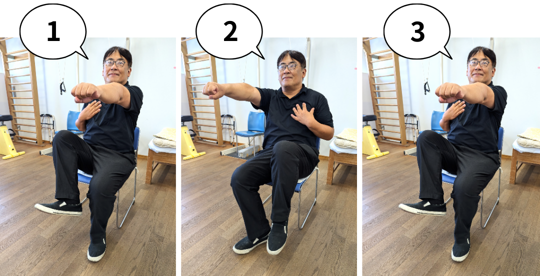 左右の手を交互に伸ばし足踏みしながら、1~10まで数えます。前にだした手はグー、胸にあてる手はパーにして10×3セット繰り返していきましょう!